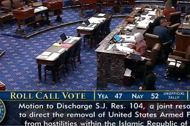 ඉරානයට එරෙහි යුද්ධය සම්බන්ධයෙන් අමෙරිකානු ජනාධිපතිවරයාට සීමා පැනවීම සඳහා අමෙරිකා එක්සත් ජනපද සෙනට් සභාවට ඉදිරිපත් වූ යෝජනාව පරාජයට පත්ව තිබේ.