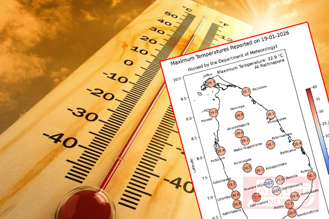 ඊයේ (19) දිනයේ දිවයිනේ උපරිම උෂ්ණත්වය සෙල්සියස් අංශක 32.9 ක් ලෙස රත්නපුර කාලගුණ මධ්යස්ථානයෙන් වාර්තා වී ඇති බව කාලගුණවිද්යා දෙපාර්තමේන්තුව පවසයි. ඊයේ දහවල් කාලයේදී කාලගුණ විද්යා දෙපාර්තමේන්තුව ප්රාදේශීය දත්ත ලබාගන්නා මධ්යස්ථානවලින් වාර්තා වූ උපරිම උෂ්ණත්ව අගයන් සෙල්සියස් අංශකවලින් සිතියමේ දැක්වේ.