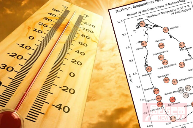 ඊයේ (20) දිනයේ දිවයිනේ උපරිම උෂ්ණත්වය සෙල්සියස් අංශක 34.2 ක් ලෙස රත්නපුර කාලගුණ මධ්යස්ථානයෙන් වාර්තා වී ඇති බව කාලගුණවිද්යා දෙපාර්තමේන්තුව පවසයි. කාලගුණවිද්යා දෙපාර්තමේන්තුවේ ප්රාදේශීය දත්ත ලබාගන්නා මධ්යස්ථානවලින් ඊයේ දහවල් කාලයේදී වාර්තා වූ උපරිම උෂ්ණත්ව අගයන් සෙල්සියස් අංශකවලින් සිතියමේ දැක්වේ.