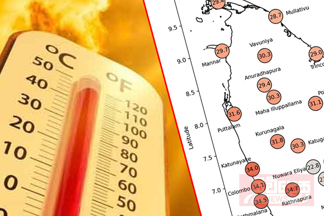 අද (27) දිනයේ දිවයිනේ උපරිම උෂ්ණත්වය සෙල්සියස් අංශක 34.7 ක් ලෙස රත්නපුර කාලගුණ මධ්යස්ථානයෙන් වාර්තා වී ඇති බව කාලගුණවිද්යා දෙපාර්තමේන්තුව පවසයි. අද දහවල් කාලයේදී කාලගුණවිද්යා දෙපාර්තමේන්තුවේ ප්රාදේශීය දත්ත ලබාගන්නා මධ්යස්ථානවලින් වාර්තා වූ උපරිම උෂ්ණත්ව අගයන් සෙල්සියස් අංශකවලින් සිතියමේ දැක්වේ.